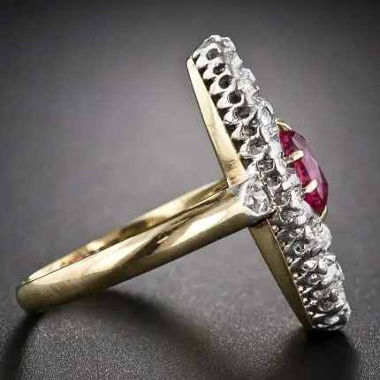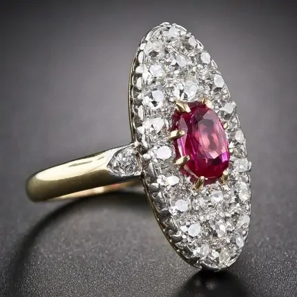 A gemmy deep-red oval ruby, weighing .81 carats, takes center stage against a glistening backdrop of old mine-cut diamonds in this sublime Edwardian age jewel, dating back to the first or second decade of the twentieth century, hand fabricated in platinum over 18 karat gold. 13/16 inch long. Currently ring size 5.
