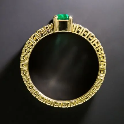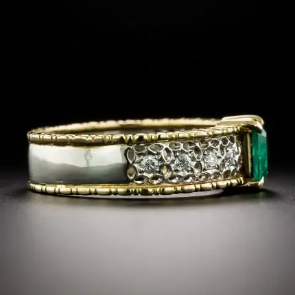 The design elements of this elegant, Buccellati-esque estate jewel create a rich textural composition with a pop of vibrant color. Its lacy platinum center glitters with eight icy-white round brilliant-cut diamonds and is trimmed in 18K yellow gold fashioned with a crisp notched design. This lovely assemblage features a .45 carat electric green emerald, all together forming a circle of color and light to adorn your finger. Currently ring size 6 3/4.
